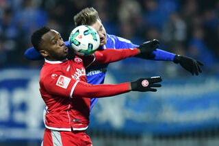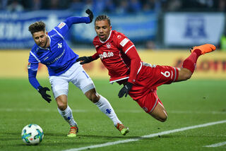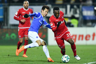Kaiserslauterns Osayamen Osawe (r) und Darmstadts Dong-Won Ji kämpfen um den Ball.