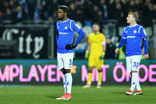 Darmstadts Joevin Jones (l) und Fabian Holland stehen auf dem Spielfeld.