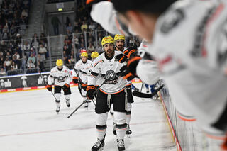 Abklatschen nach dem 0:1 - die Löwen gehen im ersten Drittel gegen die Adler in Führung.