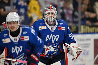 Mannheims Daniel Fischbuch (71) beim Schuss auf das Tor von Frankfurts Juho Olkinuora (45).