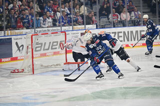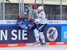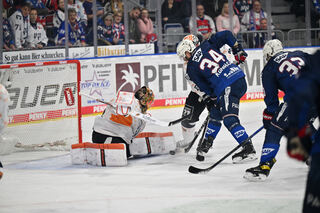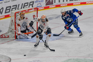 Linden Vey von Mannheim (Nr. 19) trifft gegen Dustin Strahlmeier Grizzlys (Nr. 1) zum 1:0