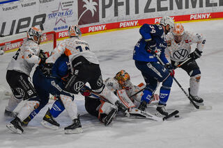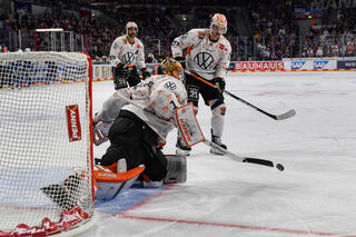 Vor dem Tor von Wolfsburgs Dustin Strahlmeier (Nr. 1). Die Adler Mannheim in dunkel und die Grizzlys Wolfsburg in hell