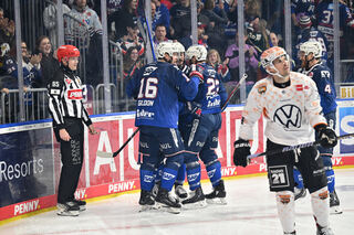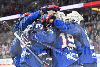 Jubel zum 3:1 nach dem Treffer von Mannheims Tom Kühnhackl (Nr. 34)