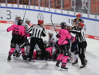 Eric Uba (Adler Mannheim) und Gerrit Fauser (Grizzlys Wolfsburg) beim Spiel