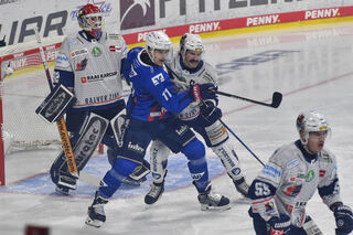 Kristian Reichel gegen Hubert Labrie vor dem Tor von Iserlohns Hendrik Hane