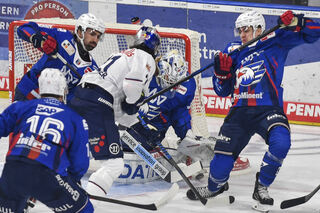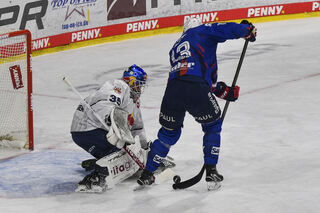 Mannheims Kristian Reichel (Nr.11) gegen Muenchens Adam Brooks /Nr.77) und im Tor Muenchens Mathias Niederberger (Nr.35).
