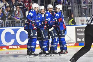 Jubel nach dem Ausgleich von Mannheims Matthias Plachta (Nr.22) zum 2:2 beim Spiel in der Penny DEL, Adler Mannheim - EHC Red Bull Muenchen.