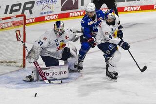 Mannheims Kristian Reichel (Nr.11) gegen Muenchens Dominik Bittner (Nr.3) und Muenchens Evan Fitzpatrick (Nr.31) beim Spiel in der Penny DEL, Adler Mannheim - EHC Red Bull Muenchen.