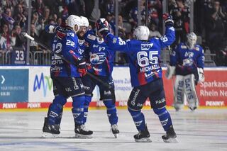 Jubel nach dem 3:2 von Mannheims Kris Bennett (Nr.21) beim Spiel in der Penny DEL, Adler Mannheim - EHC Red Bull Muenchen.