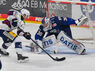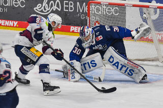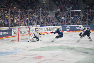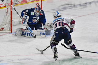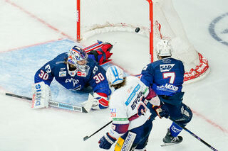 Stefan Loibl (Adler Mannheim) trifft gegen Berlins Torwart Jake Hildebrand zum 1:0!