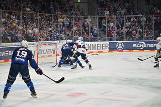 Berlins Lean Bergmann trifft zum 2:3 gegen Mannheims Arno Tiefensee.