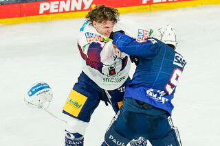 Nach Lean Bergmanns Tor zum 2:3 und der folgenden Provokation stellte Adler-Verteidiger Leon Gawanke den Berliner.