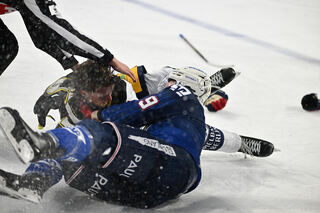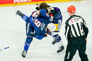 Beide Kontrahenten stürzen im Faustkampf aufs Eis.