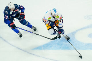 Mannheims Stefan Loibl und Berlins Blaine Byron kämpfen um den Puck.