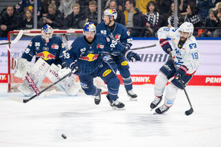 Mannheims Kristian Reichel (Nr.11) trifft zum 1:1 gegen Münchens Evan Fitzpatrick (Nr.31), links Münchens Jonathon Blum (Nr.24).