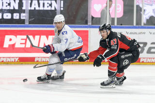 Kölns Nicholas Bailen (Nr.7) blockt vor Kölns Mirko Pantkowski (Nr.30) beim Spiel in der Penny DEL.