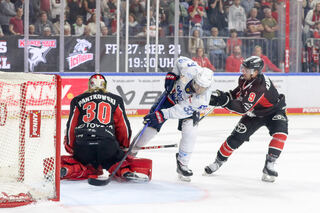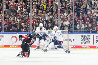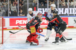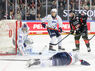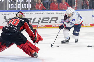 Mannheims Markus Haennikaeinen (Nr.33) mit Chance gegen Kölns Mirko Pantkowski (Nr.30) beim Spiel in der Penny DEL.