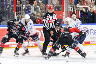 Bully Zeit beim Spiel in der Penny DEL, Koelner Haie (dunkel) - Adler Mannheim (hell).