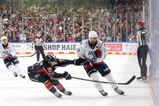 Mannheims John Gilmour (Nr.7) im Zweikampf mit Kölns Veli-Matti Vittasmaeki (Nr.47) beim Spiel in der Penny DEL.