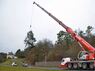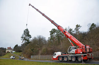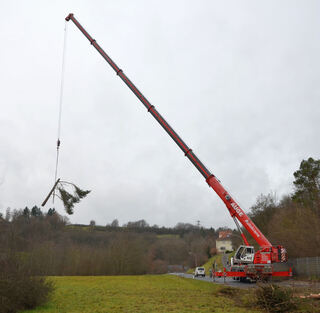Der 100-Tonnen-Kran hievt den gefällten Baum aus dem Wald.