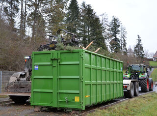 Die Äste und Stämme werden auf einem Container abgeladen. Daraus sollen Hackschnitzel gemacht werden.
