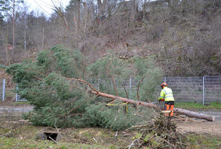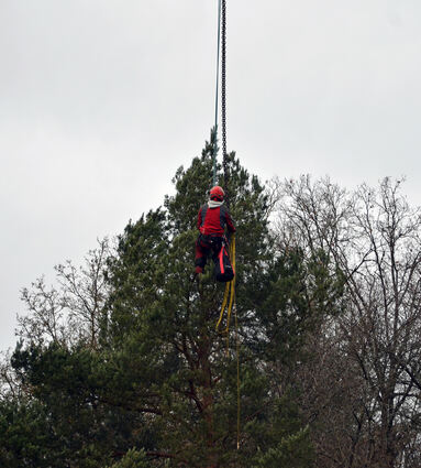 Andreas Schätzlein befestigt einen Gurt am Baum, ehe er in absägt.