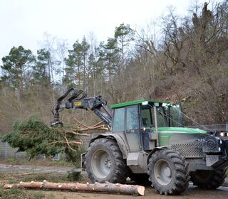 Das Rückegerät transportiert die Baumstämme ab, nachdem sie zerteilt wurden.