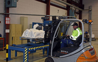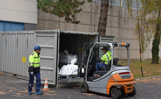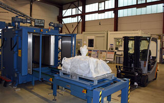 © Ralf SchererDie erste Charge Rückbaumaterial aus dem Kernkraftwerk Obrigheim steht kontrolliert und verpackt zur Lieferung an die Deponie Sansenhecken bereit.