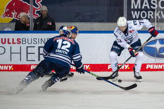Mannheims Daniel Fischbuch im Duell gegen Benjamin Smith von EHC München.