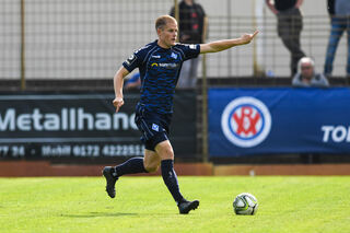 Marcel Seegert gibt mit dem Ball am Fuß Kommandos an seine Vorderleute.