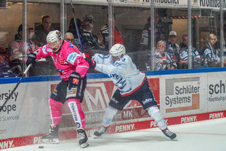 Colton Jobke von den Iserlohn Roosters fordert Yannick Proske von den Adler Mannheim in einem packenden Zweikampf.