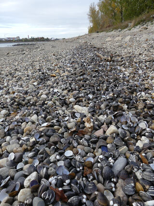 Geht der Wasserspiegel des Rheins zurück, sitzen die Muscheln auf dem Trockenen. Bild: Heidenreich