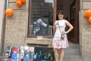 Künstlerin Nicole Malek vor „no frills – Webdesign“ mit ihrer Analog-Kamera aus den 60er Jahren.