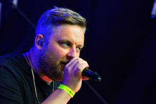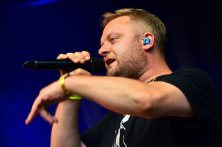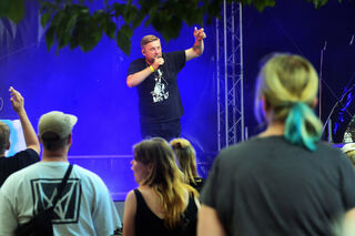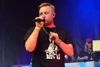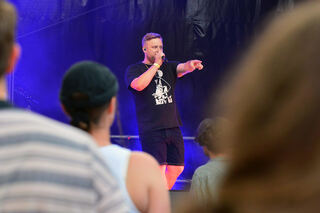 Fatoni steht ganz vorn auf der Bühne, kurz ist er fast nicht mehr zu sehen. So viel Sand.