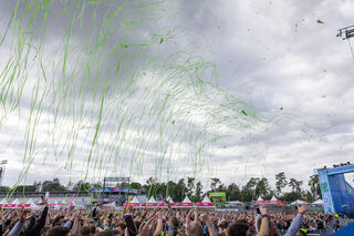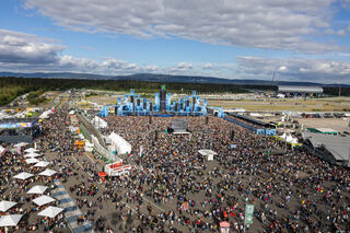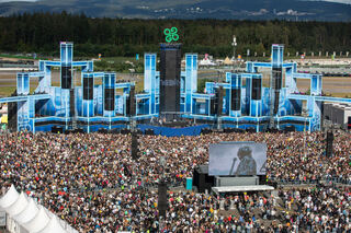 Blick aus dem Riesenrad auf das Festivalgelände, hier die Cloud 9 Stage beim Auftritt von Neelix