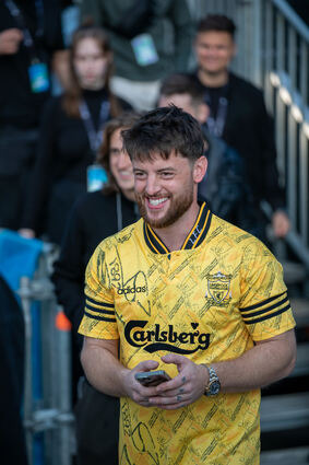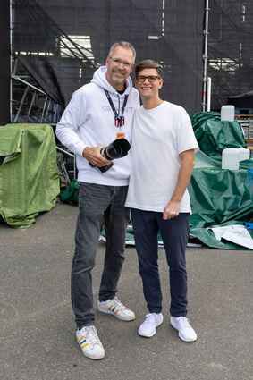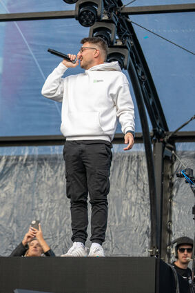 Bausa kommt gut gelaunt nach seinem Auftritt von der Bühne