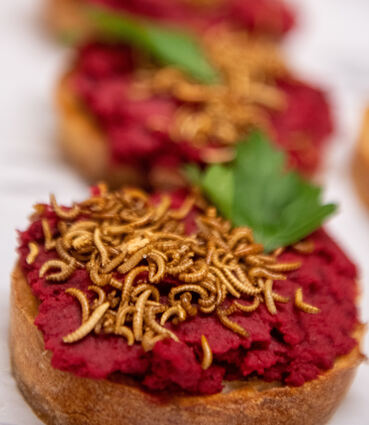 Auf einem Brot befindet sich ein Rote Beete Hummus, das mit Buffalowürmern garniert ist.