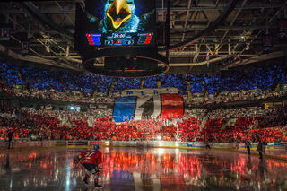 Auch in anderen Sportarten gibt es Choreografien: 2015 organisierten Fans der Adler diese Choreografie mit dem Logo der Mannschaft. (Bild: Binder)