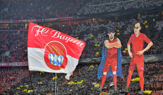Die Fans vom FC Bayern unterstützten ihre Mannschaft mit den Darstellungen der Spieler Franck Ribéry (links) und Arjen Robben als "Badman" und "Robben" in Anlehnung an "Batman und Robin". (Bild: dpa)