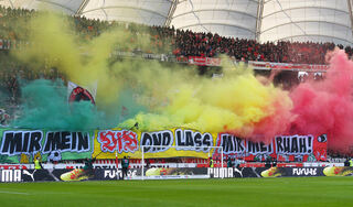 Die Fans des VfB Stuttgart feuerten ihre Mannschaft am 24. Februar dieses Jahr beim Bundesliga-Spiel gegen Eintracht Frankfurt mit dieser Choreografie in der Mercedes-Benz-Arena in Stuttgart an. "Lass mir mein' VfB ond lass mir mei Ruah" ist ein Fanlied.