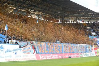 Zum Einlauf der Mannschaft von Hansa Rostock gegen den FSV Mainz 05 ll im Oktober 2016 warfen die Fans tausende gold gefärbte Blätter.