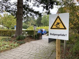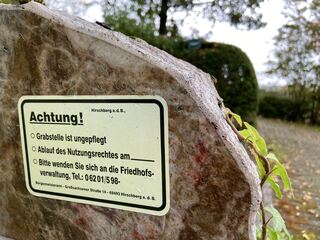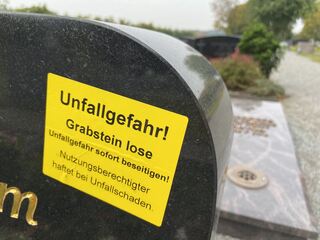 An manchen Grabsteinen klebt ein Warnschild der Friedhofsverwaltung.