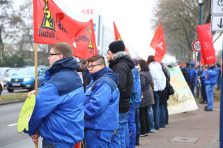 Mehrere hundert GE-Mitarbeiter haben am Montagnachmittag mit einer Menschenkette um das Werk in Mannheim-Käfertal für den Erhalt ihrer Arbeitsplätze demonstriert