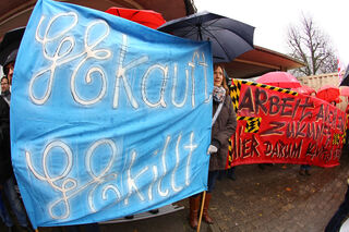 Mit Plakaten machen die Angestellten ihrem Ärger Luft.