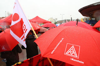 Die Angestellten protestierten vor dem Werkstor 6 in Mannheim-Käfertal.