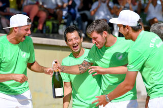 Daniel Steinbrenner (v.l.), Björn Phau, Gerald Melzer, und Andreas Beck begießen mit Sekt die Meisterschaft.