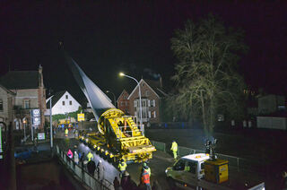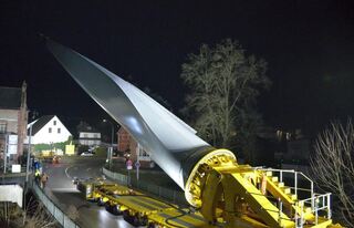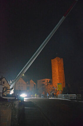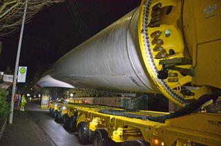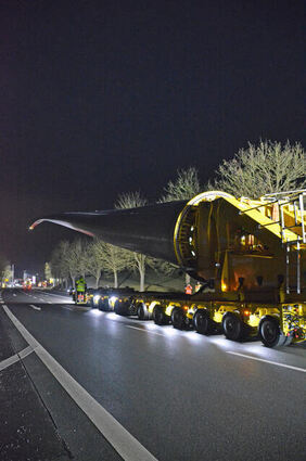 Mit einem Selbstfahrer wurde am Mittwochabend ein Rotorblatt durch die enge Ortsdurchfahrt Hardheims transportiert.
