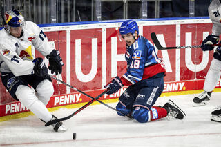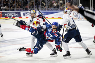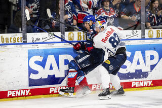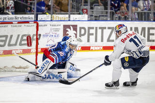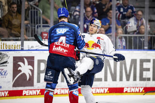 Korbinian Holzer (Adler Mannheim) wehrt Ben Smith vom Red Bull München ab.