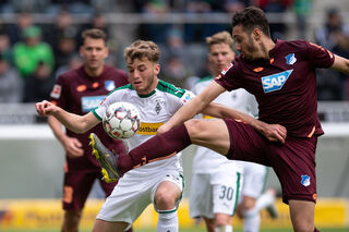 Gladbachs Louis Beyer (Mitte) und Hoffenheims Ishak Belfodil versuchen an den Ball zu kommen.