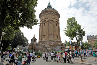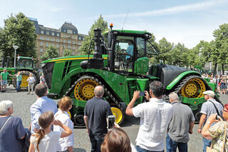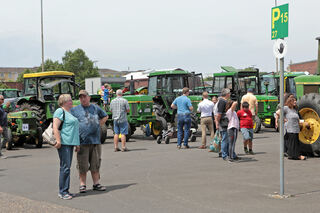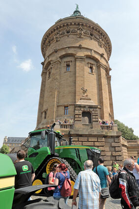 Zahlreiche grüne Traktoren von John Deere fuhren um den Wasserturm.